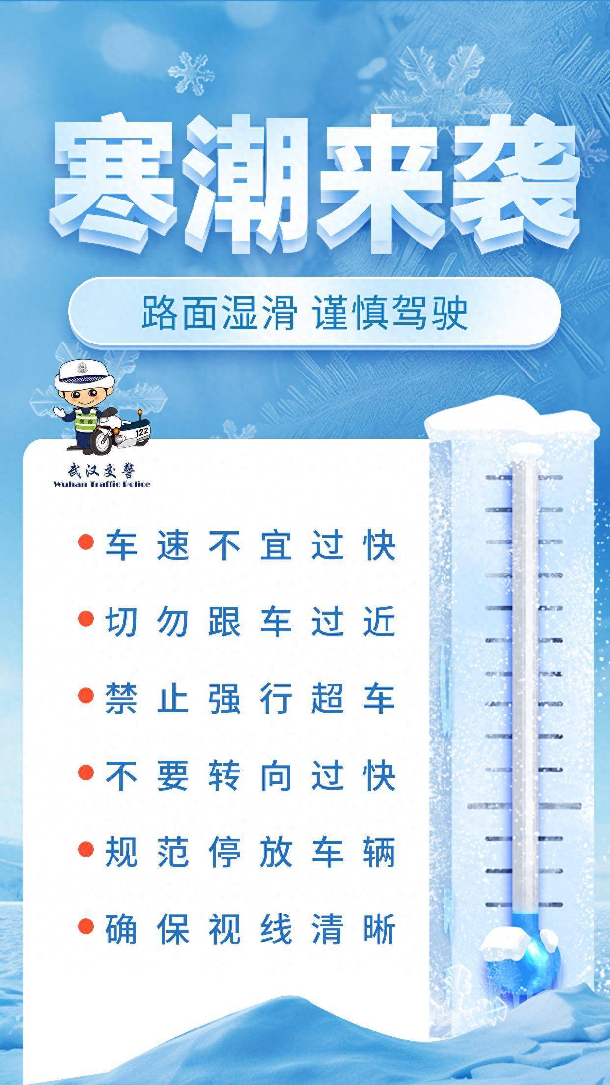 据武汉市气象台预报,12日至13日受高空低槽东移和地面较强冷空气影响,武汉市有大风降温降水天气发生,气温将下降10℃。武汉交警提醒广大市民,出行请提前检查车况、注意防滑,规划好出行线路,避免出现意外状况。
