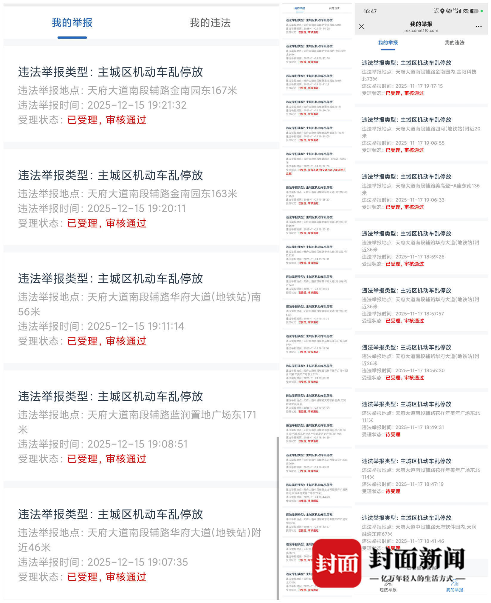 他主要通过手机拍照上传的方式在蓉e行进行举报,现在因举报违停需要一个半小时才能完成。七天下来,他累计提交了92次举报,其中89次审核通过,3次因照片模糊或角度不符合要求未通过。